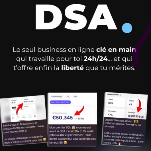La Digital Success Academy (DSA) est le programme idéal si tu veux créer un business en ligne rentable tout en restant alignée avec ta vie de femme, de maman ou de salariée. Tu y apprends une méthode simple et claire pour mettre en place un système capable de générer des revenus digitaux réels et durables.